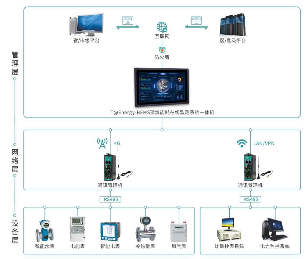 設(shè)備層:主要由電能表、水表、燃?xì)獗?、冷熱量、蒸汽表以及第三方監(jiān)測(cè)系統(tǒng)組成。