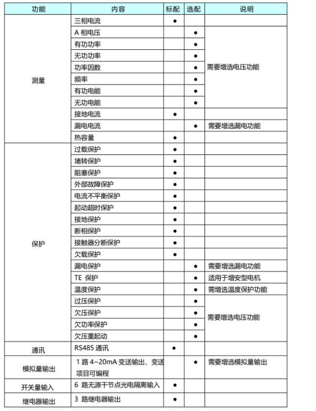 5、完善的電動(dòng)機(jī)保護(hù)功能:基本保護(hù)包括(起動(dòng)超時(shí)保護(hù)、過(guò)載、堵轉(zhuǎn)、斷相、電流不平衡、接地、欠載.阻塞等)還可以根據(jù)需要增選保護(hù)功能(漏電保護(hù)、溫度保護(hù)、過(guò)壓保護(hù)、欠壓保護(hù)、欠功率保護(hù)等)