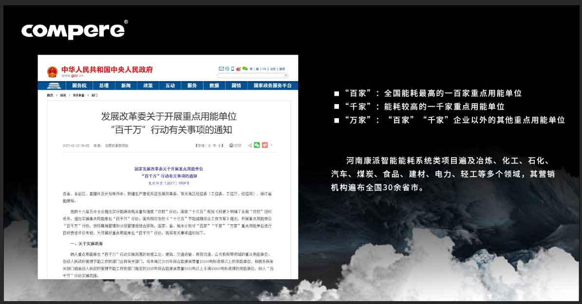 T@Energy-Online能耗在線監(jiān)測系統(tǒng),是康派智能自主研發(fā)的能耗監(jiān)測系統(tǒng),積極響應(yīng)了國家發(fā)展改革委關(guān)于能耗在線監(jiān)測系統(tǒng)推廣建設(shè)通知,在協(xié)助重點用能單位信息化轉(zhuǎn)型、促進(jìn)節(jié)能增效并提升市場競爭力的同時,完成系統(tǒng)建設(shè)任務(wù)與數(shù)據(jù)上傳要求,通過政府驗收。
