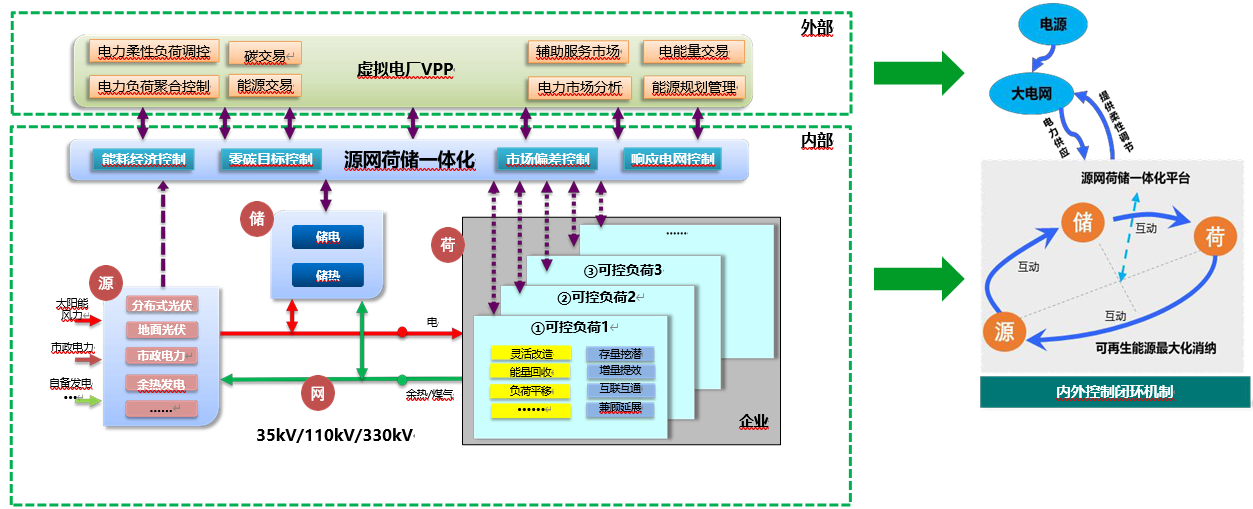 n 彈性調(diào)度:以虛擬電廠與電網(wǎng)的分界線,對內(nèi)構(gòu)建完整的系統(tǒng)閉環(huán),通過儲能調(diào)節(jié)、源荷互動及柔性負(fù)荷響應(yīng)等,實現(xiàn)安全用電和可再生能源的最大化消納;