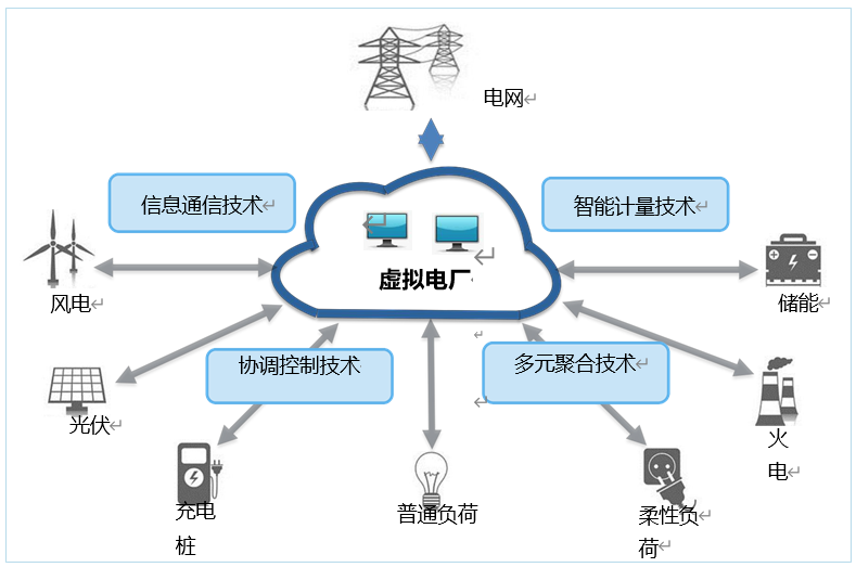 通過智能調(diào)控、通信技術(shù)整合各種形式的分布 式發(fā)電、負(fù)荷、儲能等資源,作為一個調(diào)控性能好的“虛擬電廠”來參與電力供需調(diào)節(jié)。