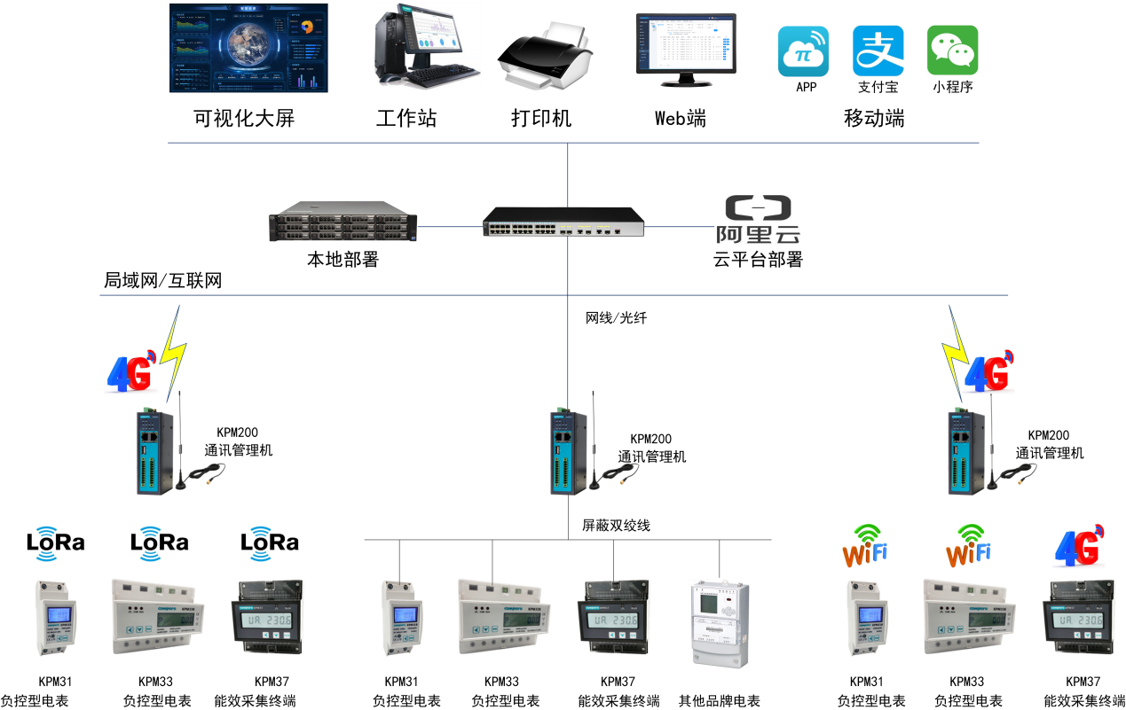 現(xiàn)場(chǎng)采用RS485、以太網(wǎng)GPRS、4G、NB-ot.lora、 Zigbeeifi等傳輸方式,將區(qū)域內(nèi)的電力采集模塊連接至相對(duì)的通訊管理機(jī);各通訊管理機(jī)通過(guò)用戶局域網(wǎng)連接至中央服務(wù)器。