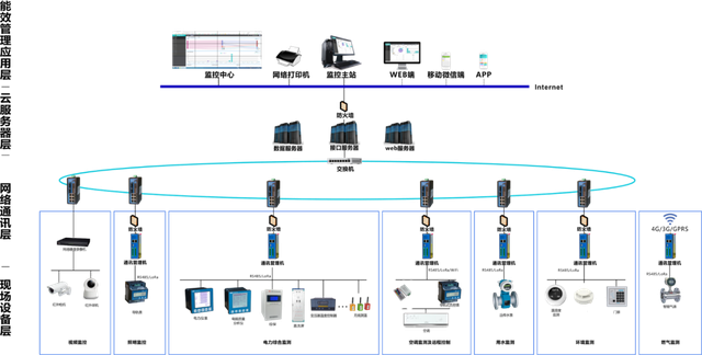 現(xiàn)場設備層:主要是連接于網絡中用于水、電、氣等參量采集測量的各類型的儀表等,也是構建該配電、耗水、耗氣系統(tǒng)必要的基本組成元素。肩負著采集數(shù)據(jù)的重任,這些設備可為本公司各系列帶通訊網絡電力儀表、溫濕度控制器、開關量監(jiān)測模塊以及合格供應商的水表、氣表、冷熱量表等。
