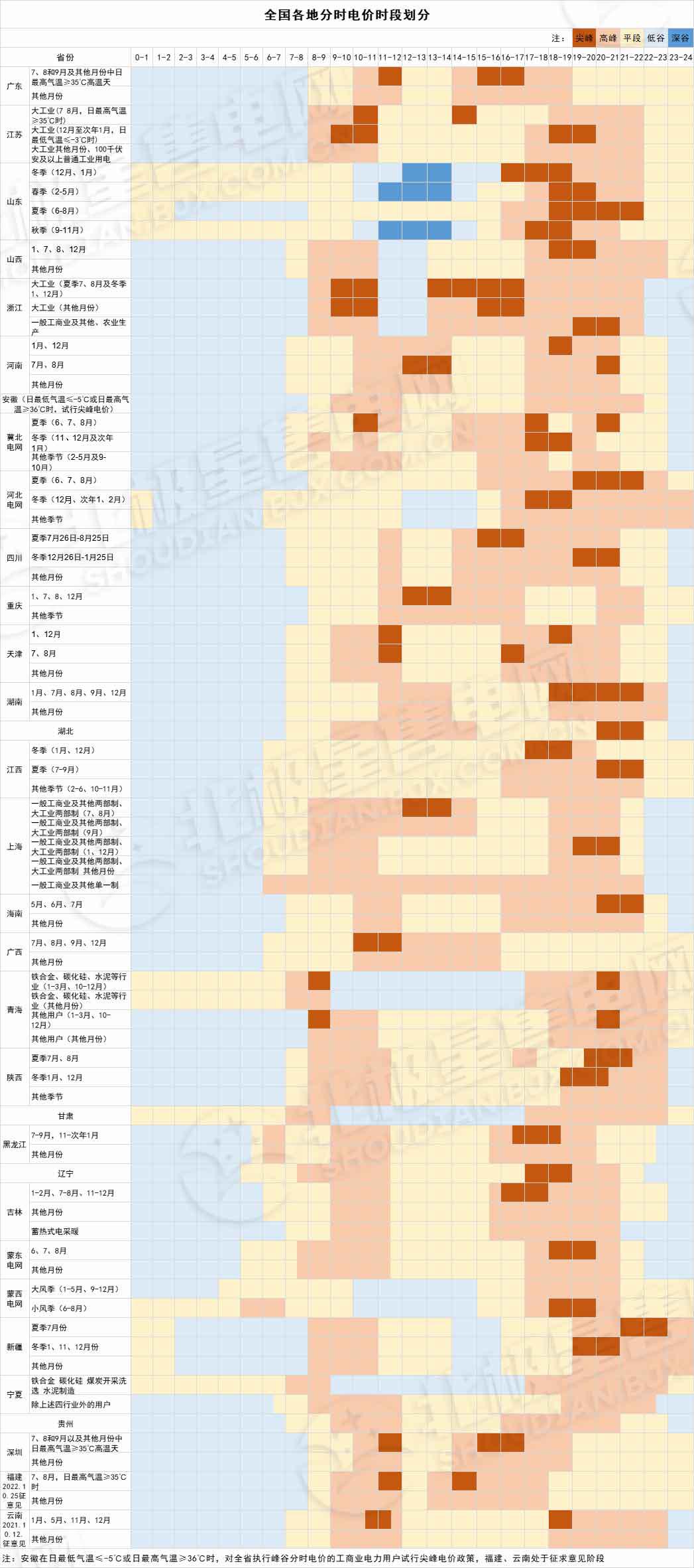 全國(guó)各地分時(shí)電價(jià)時(shí)段劃分情況