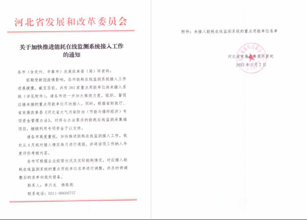 日前,河北省發(fā)改革委會(huì)下發(fā)紅頭文件,要求未接入能耗在線監(jiān)測系統(tǒng)的重點(diǎn)用能單位請(qǐng)盡快接入,具體文件內(nèi)容如下: