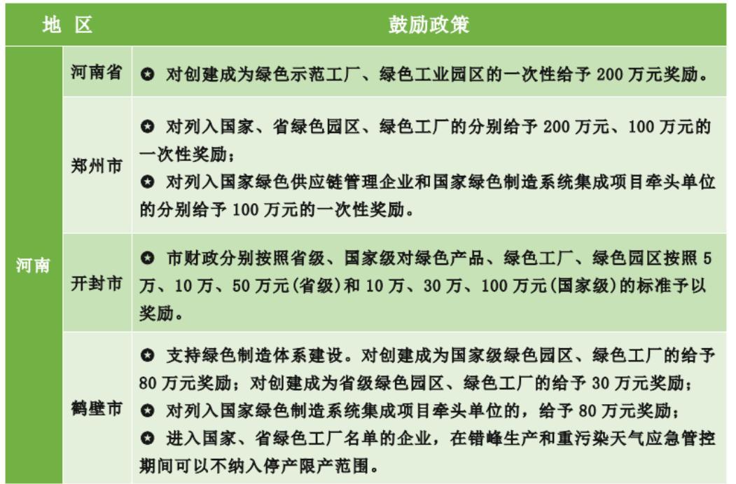 洛陽市:獲評省級綠色工廠的企業(yè),市財(cái)政給予50萬元一次性獎(jiǎng)勵(lì)。