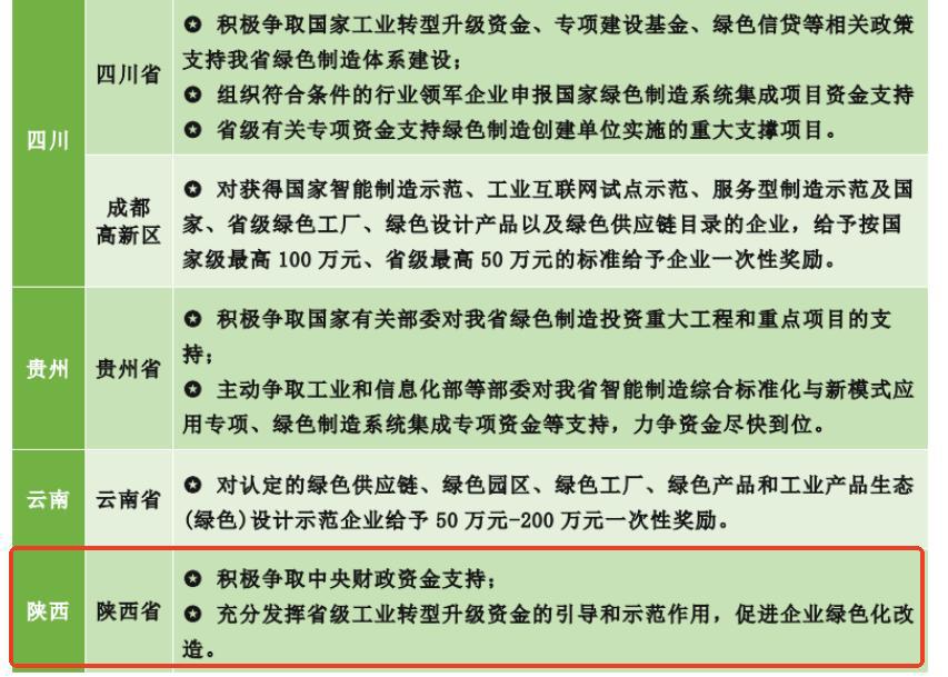 為貫徹落實(shí)《“十四五”工業(yè)綠色發(fā)展規(guī)劃》《工業(yè)領(lǐng)域碳達(dá)峰實(shí)施方案》,各省份積極響應(yīng)并分別發(fā)布了依據(jù)本地區(qū)特點(diǎn)制定的相關(guān)政策,為激勵(lì)工業(yè)企業(yè)積極進(jìn)行綠色工廠、綠色設(shè)計(jì)產(chǎn)品、綠色園區(qū)創(chuàng)建和申報(bào),大部分地區(qū)政府對(duì)于入選國(guó)家級(jí)綠色園區(qū)、工廠名單的企業(yè)給予一次性獎(jiǎng)勵(lì)100萬元,部分城市的獎(jiǎng)勵(lì)金額更是達(dá)到了1000萬元。關(guān)于綠色工廠,不同的省市都有不同的鼓勵(lì)性政策補(bǔ)貼,下圖是山西省份的政策補(bǔ)貼: