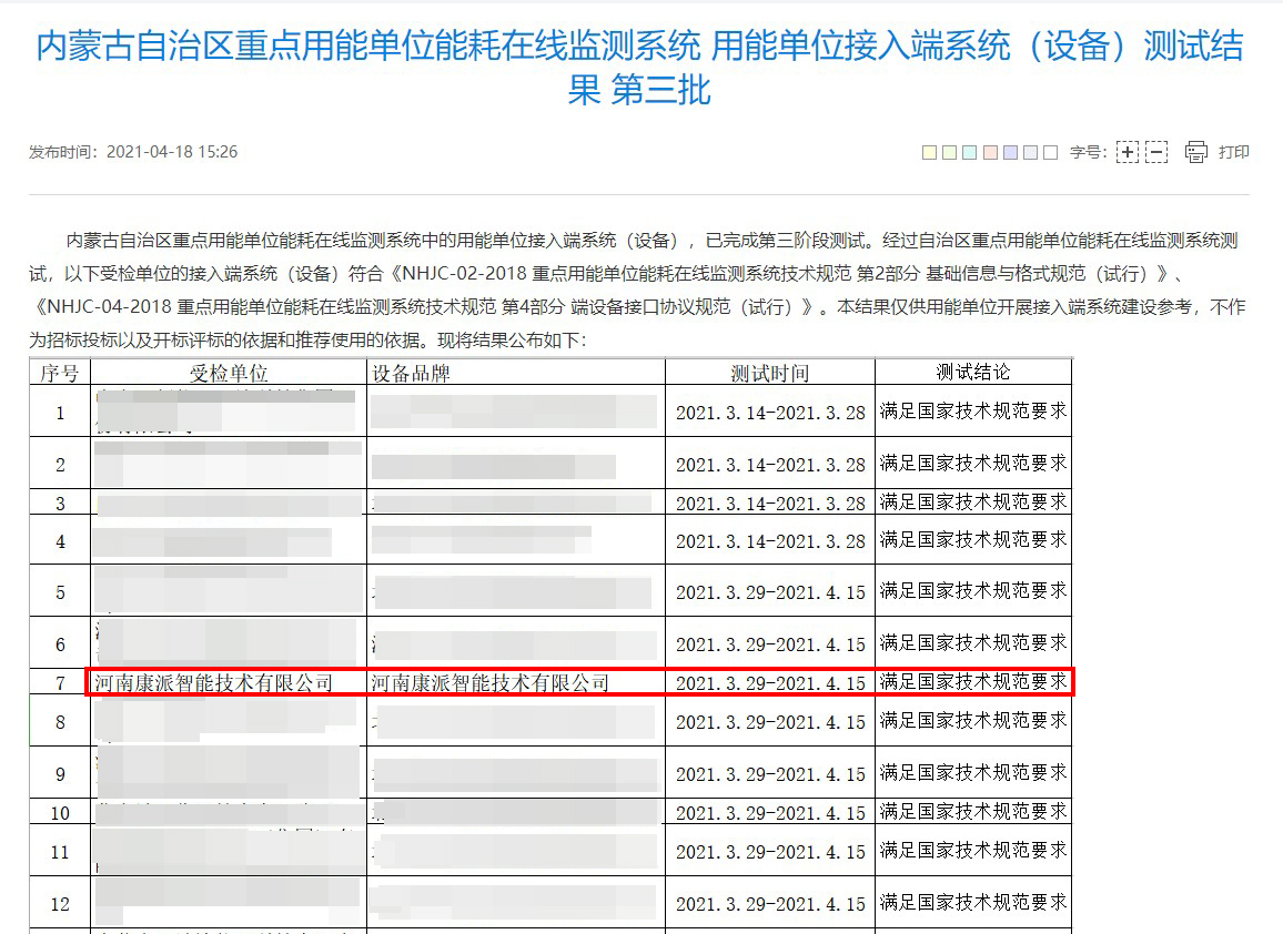 2021年4月18日,內(nèi)蒙古自治區(qū)重點用能單位能耗在線監(jiān)測系統(tǒng)中的用能單位接入端系統(tǒng)(設(shè)備),已通過第三階段測評。經(jīng)過內(nèi)蒙古自治區(qū)計量測試研究院測評,康派智能能耗在線監(jiān)測端設(shè)備符合內(nèi)蒙古自治區(qū)重點用能單位能耗在線監(jiān)測系統(tǒng)技術(shù)要求。公布結(jié)果如下圖所示: