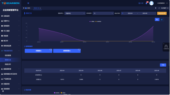 ·效益分析:展示企業(yè)的節(jié)能減碳的項目理論減排量和實際減碳量對比,減排趨勢